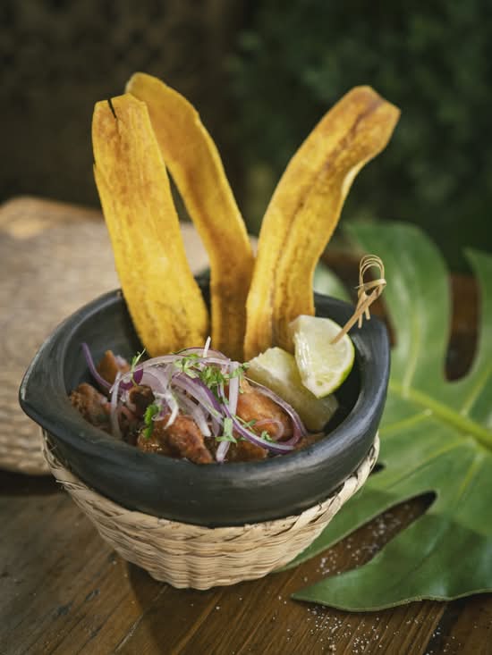 Crispy pork bites with fresh onion,tomato, cilantro, lime, and Green plantain chips. Special house sauce. Trocitos de chicharrón con cebolla fresca, tomate, cilantro, limon y chifles de plátano verde. Salsa especial.