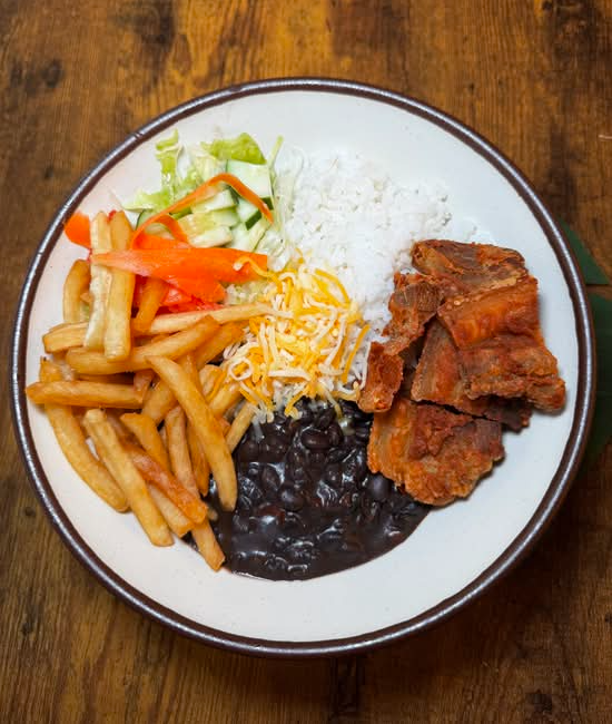 White rice, black beans, shredded beef, sweet plantain, and avocado Arroz, frijol negro, carne mechada, maduro, y aguacate