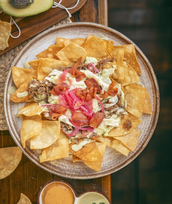 Nachos topped with shredded beef, tomatoes, cheese, and our signature Casa Avocado sauce. Nachos con carne mechada, tomate, queso y crema de aguacate Colven.
