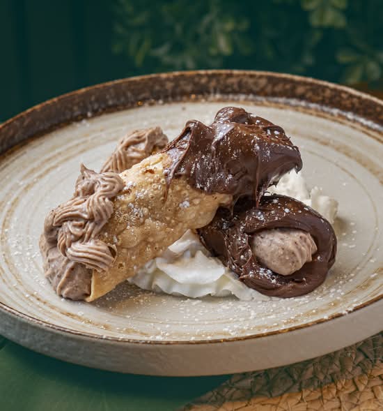 Crispy puff pastry filled with Nutella chocolate cream and whipped cream, dusted with powdered sugar. Crujiente hojaldre relleno de crema de chocolate Nutella y chantillí, con lluvia de azúcar pulverizada.
