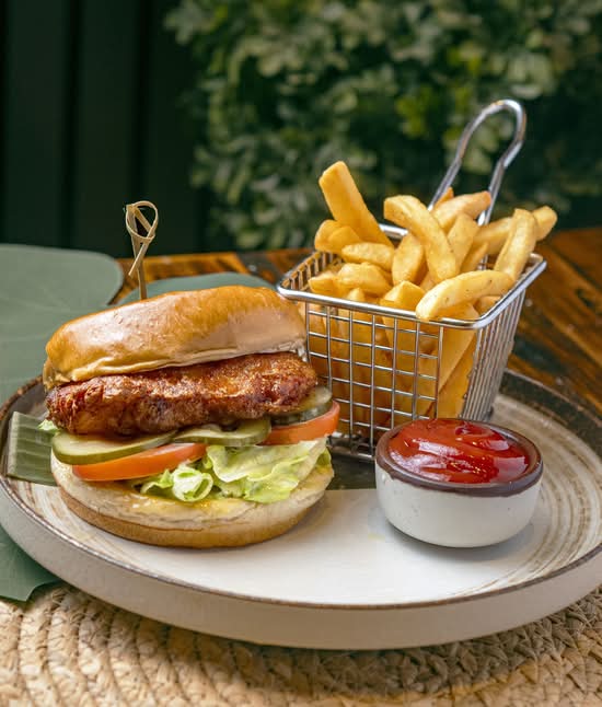 Brioche bun filled with breaded chicken, lettuce, tomato, and honey mustard. Served with French fries. Pan brioche relleno con pollo empanizado, lechuga, tomate y miel mostaza. Acompañado de papas fritas.